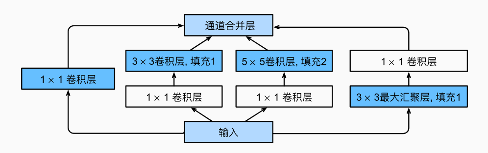 在GoogLeNet中,基本的卷积块被称为Inception块(Inception block),Inception块由四条并行路径组成。 前三条路径使用窗口大小为1x1、3x3和的5x5卷积层,从不同空间大小中提取信息。 中间的两条路径在输入上执行1x1卷积,以减少通道数,从而降低模型的复杂性。 第四条路径使用3x3最大汇聚层,然后使用卷积层来改变通道数。 这四条路径都使用合适的填充来使输入与输出的高和宽一致,最后我们将每条线路的输出在通道维度上连结,并构成Inception块的输出。在Inception块中,通常调整的超参数是每层输出通道数。