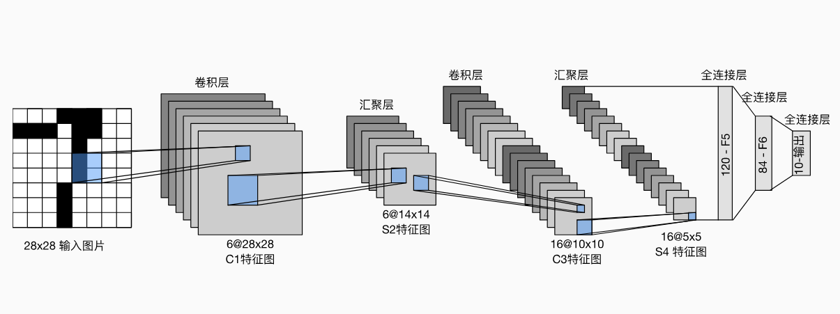 我们对原始模型做了一点小改动,去掉了最后一层的高斯激活。除此之外,这个网络与最初的LeNet-5一致。
